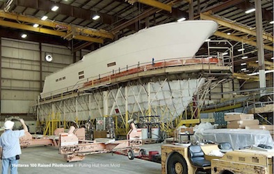 Just received some progress notes on the new Hatteras 100 Raised Pilothouse, which is scheduled to debut next fall. It shows lamination work on the hull with engineers and craftsmen laying in electrical, plumbing and propulsion systems.