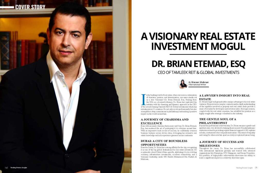 In the bustling world of real estate, where success is a culmination of charisma, passion, and determination, one name stands out as a true visionary—Dr. Brian Etemad, Esq. Hailing from the USA as a licensed Attorney, Dr. Brian has captivated the industry with his charming and dynamic approach as the CEO of the award-winning Tamleek REIT & Global Investments which has investments in 13 countries. He not only excels professionally but also exemplifies a deep commitment to philanthropy and making a positive impact on the world around him.