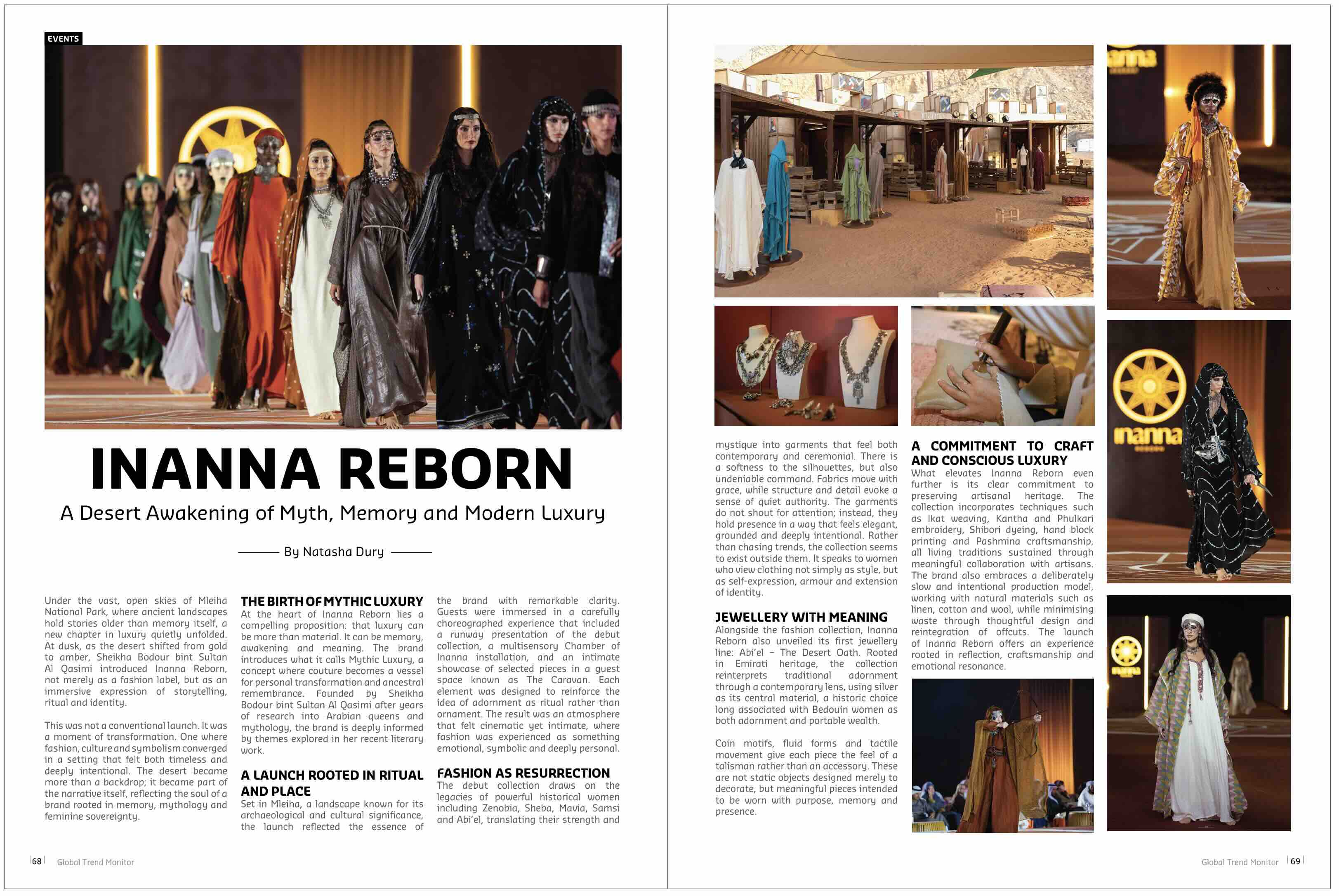 Set in Mleiha, a landscape known for its archaeological and cultural significance, the launch reflected the essence of the brand with remarkable clarity. Guests were immersed in a carefully choreographed experience that included a runway presentation of the debut collection, a multisensory Chamber of Inanna installation, and an intimate showcase of selected pieces in a guest space known as The Caravan. Each element was designed to reinforce the idea of adornment as ritual rather than ornament. The result was an atmosphere that felt cinematic yet intimate, where fashion was experienced as something emotional, symbolic and deeply personal.